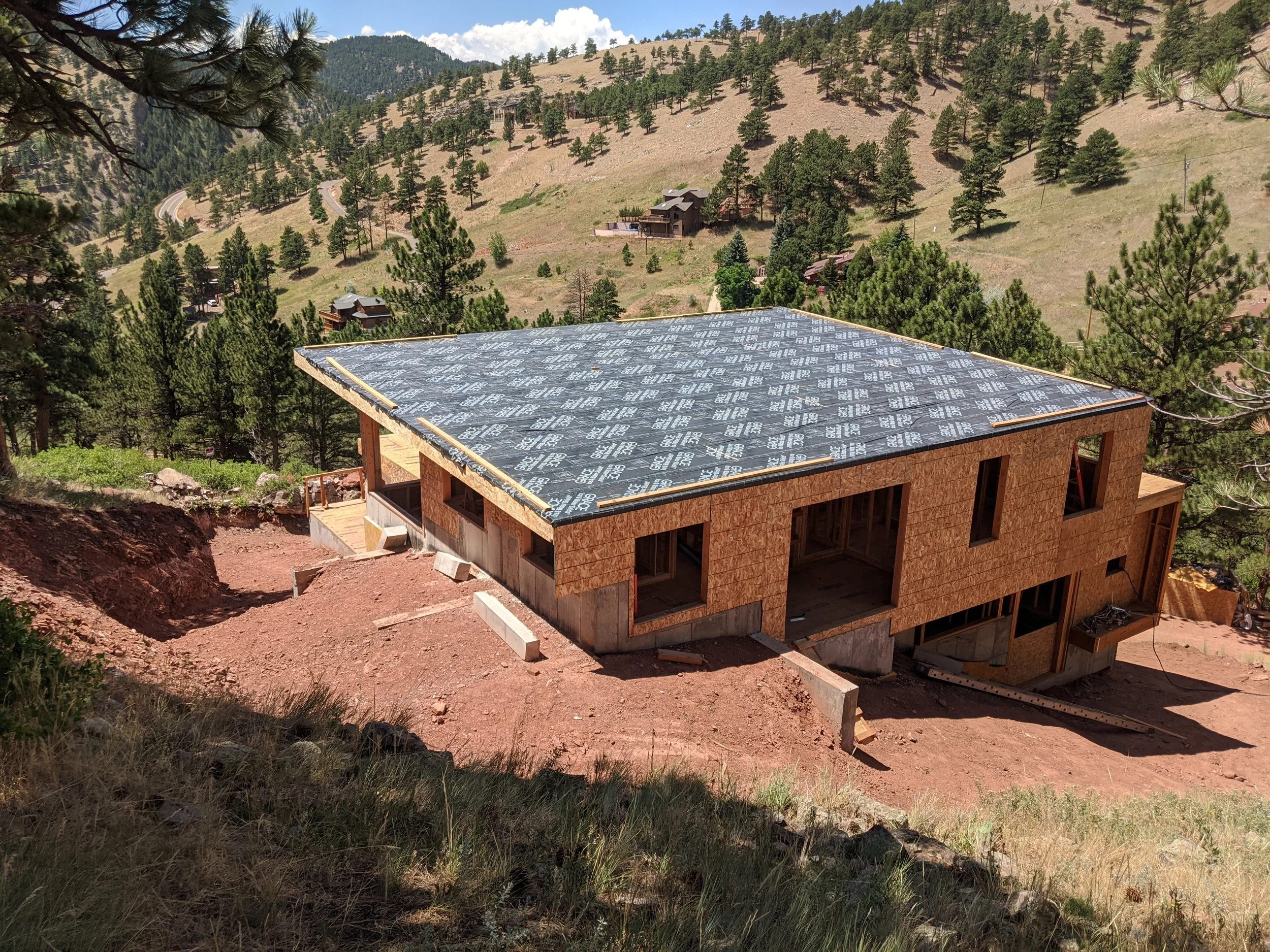 This modern style home, located in Boulder, is nestled into the side of the hill off Old Stage Road. The project consisted of almost a 20 foot retaining wall with both the basement and main level floor systems partially below grade. The home was design and built to be passive with slight modifications to the existing mechanical systems.
